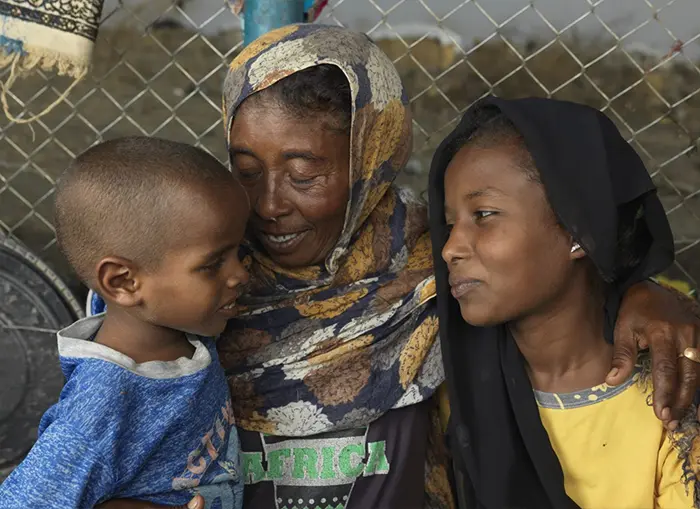 Saud Yosif and her children Asia* and Hassan* at their shelter at the transit center in Renk. Photo credit: Peter Caton/Oxfam