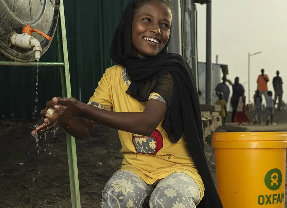 Asia washes her hands and collects water from a water point set up by Oxfam in Renk South Sudan. Photo credit: Peter Caton/Oxfam